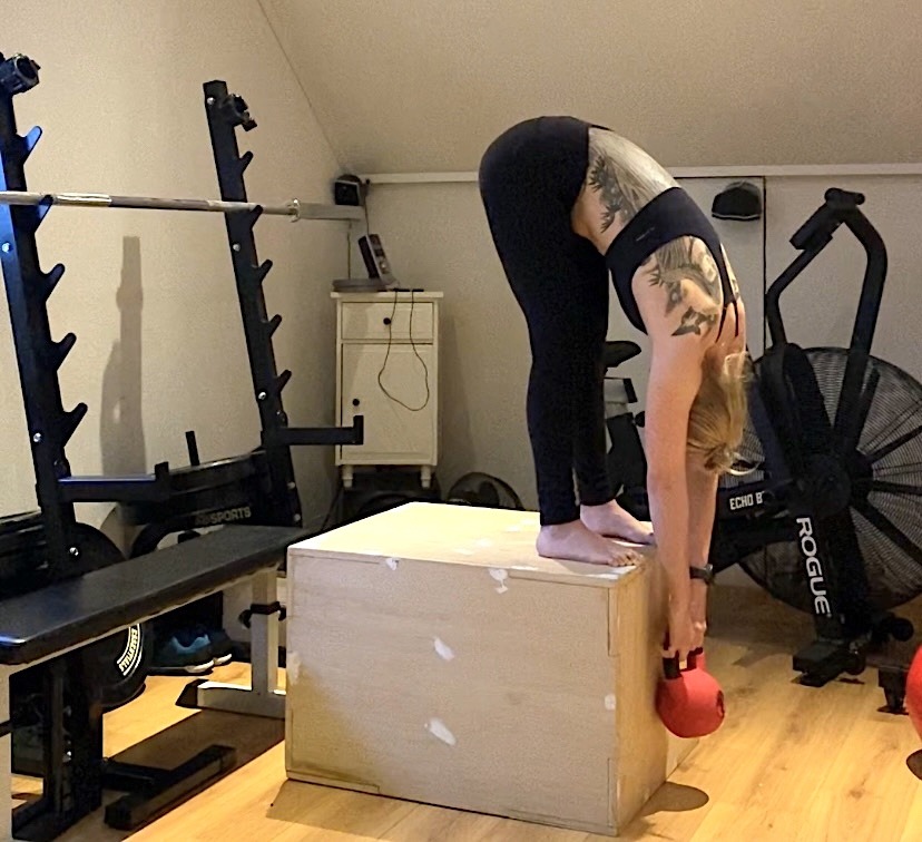 Goed, je hebt voldoende bewegingsbereik. Ook weet je hoe je je bekken en heupen kunt activeren. Nu kun je gaan werken aan kracht. Oftewel, gewicht toevoegen aan de beweging. Wanneer je een gewicht dicht bij het middelpunt houdt tijdens het doen van een squat, kun je je beter focussen op de positie van het bekken en de lumbale wervelkolom. Een voorbeeld hiervan is een Zercher-squat of een Goblet-squat. Ook een langzame excentrische beweging en geïntegreerde pauzes (pauzesquats) gedurende het laagste punt van de squat zorgen voor een toename van controle. Beperk de squatdiepte wanneer nodig. Squat pas dieper als je merkt dat je controle toeneemt.
