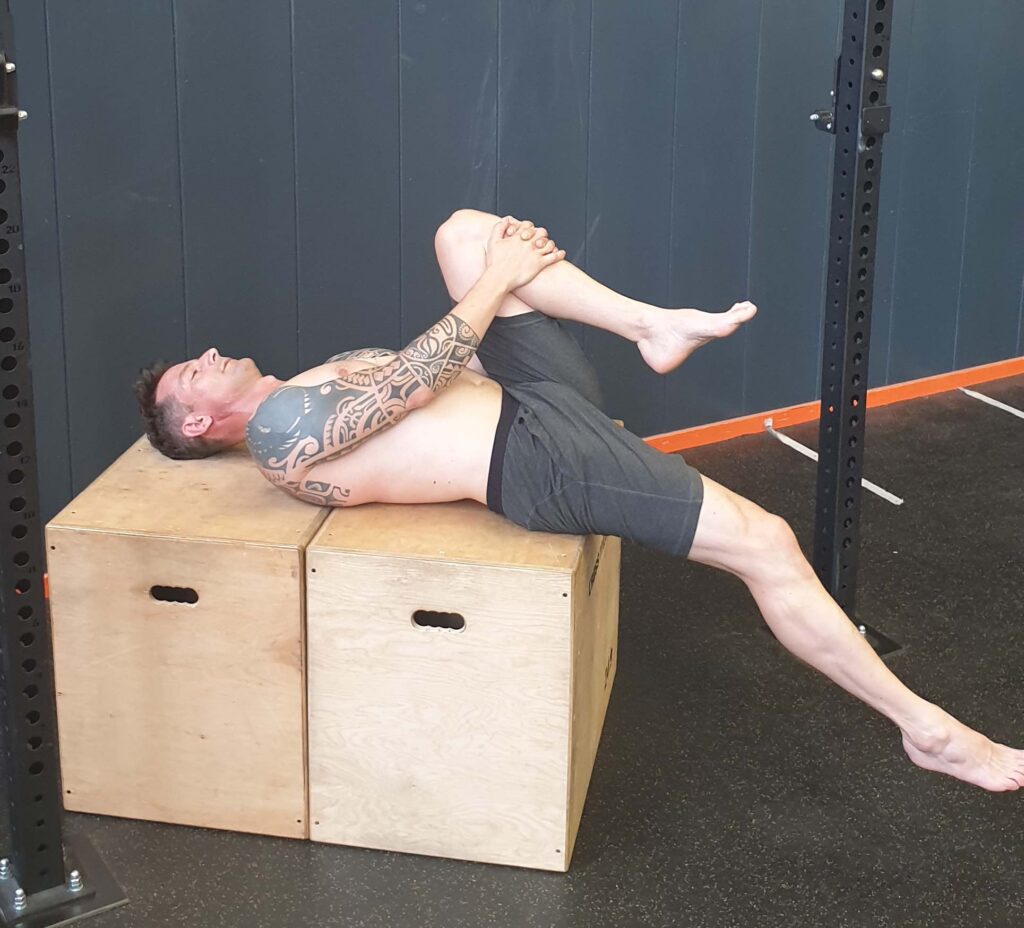 Ga liggen. Strek één been kaarsrecht uit. Heb je minder dan 70 tot 80 graden heupflexie? En als je je been buigt? Dan kan jouw gebogen knie waarschijnlijk je heupflexie vergroten. Oftewel, je kunt je been verder richting je borst bewegen. Maar buig je je knie en ontstaat er niet meer heupflexie, dan kan dit een indicatie zijn voor stijve of strakke bilspieren. De Figure4Stretch (zie afbeelding) en andere oefeningen helpen je om meer flexibiliteit te creëren.