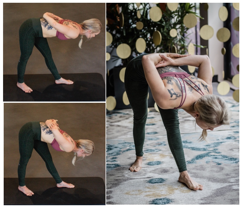 2. Gebogen benen en naar de lange zijde gedraaide heupen zien we ook vaak tijdens de Intense Side Stretch. Probeer je heupen naast elkaar te houden. Ze wijzen recht naar voren. De knieën van beide benen blijven gestrekt zodat je meer rek op je hamstrings voelt.