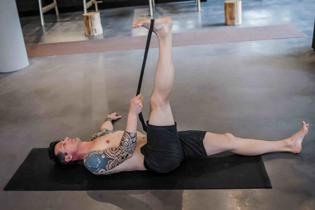 Haal vervolgens de spanning van je been af. Leg daarna je rechterhand op je bovenbeen. Duw je bovenbeen vervolgens tegen je handpalm aan (dus omhoog). Dit een vorm van yielding isometric, oftewel RAILs. Door het push- en pullmechanisme, ook wel mobiliteitstraining genoemd, kan er meer (bewegings)ruimte in het gewricht ontstaan.