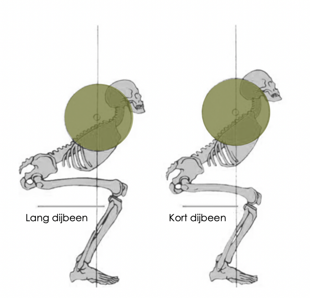 Toen ik ooit de opleiding tot CrossFit-trainer volgde, vertelde de coach mij dat mijn bovenlichaam te ver naar voren leunde. Sterker nog, ik moest werken aan flexibiliteit volgens hem. Ik probeerde hem nog uit te leggen dat ik juist erg flexibel ben, maar die woorden waren aan hem niet besteed. Hoe zit het dan wel? Hoe langer je dijbeen is, hoe meer je bovenlichaam naar voren helt. Onderzoek wijst uit dat de gemiddelde dijbeenlengte bij zowel vrouwen als mannen ongeveer 25 procent van de lichaamslengte. En wat blijkt, bij mij is deze lengte 31 procent! Helt je bovenlichaam tijdens de squat voorover? Meet dan eens je dijbeenlengte. Zit rechtop op een stoel met je rug tegen de leuning. Meet de afstand tussen de rugleuning (zijde waar je tegenaan zit) en de voorzijde van de knie. Gebruik vervolgens deze formule: