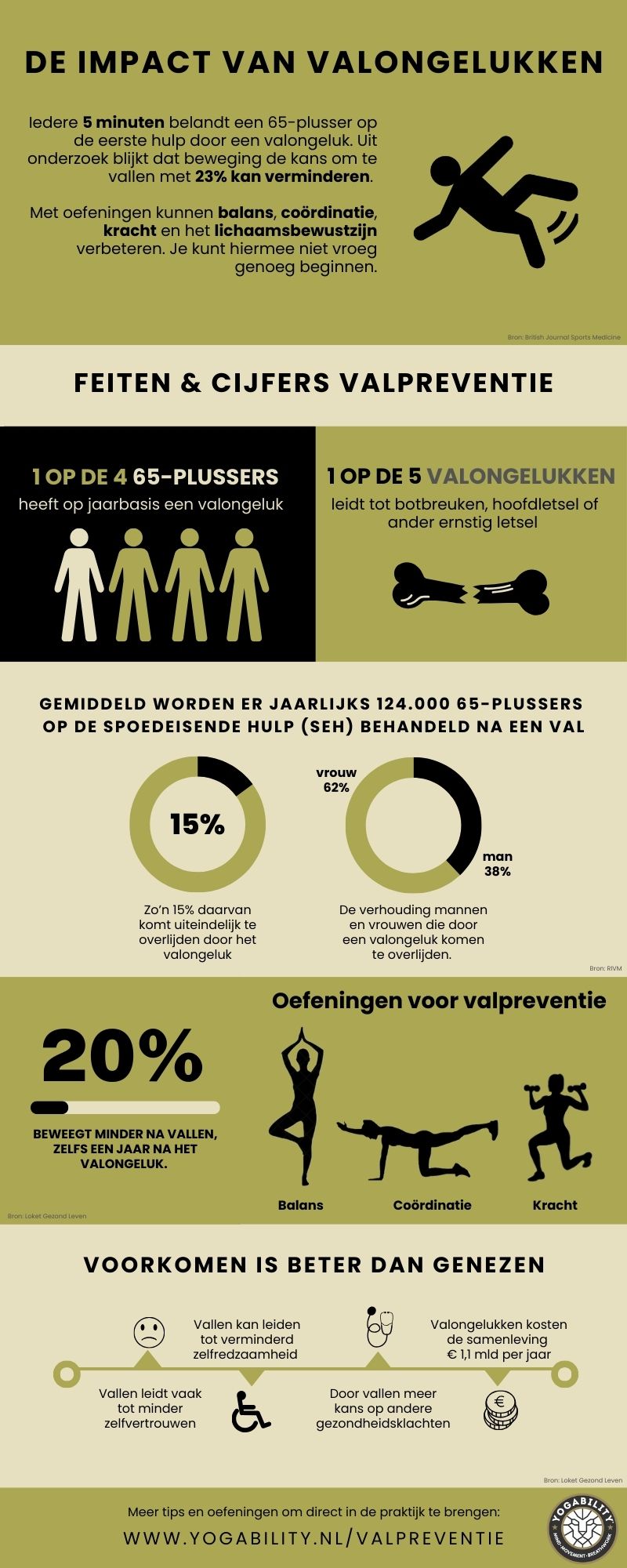 Uit onderzoek blijkt dat één op de vier mensen boven de 65 elk jaar ten minste één keer valt. Boven de 80 is dat zelfs de helft. Deze valpartijen leiden soms tot ernstige blessures, zoals een gebroken heup. En dat heeft meestal langdurige gevolgen, zowel fysiek als mentaal. Door valpartijen raakt ook het zelfvertrouwen aangetast. Hierdoor worden mensen angstiger om te bewegen. Het gevolg? Mobiliteit neemt af, spieren verzwakken en daardoor neemt ook de kans dat iemand valt toe. Kortom: er ontstaat een vicieuze cirkel. Met deze oefeningen helpen je om valongelukken te voorkomen.